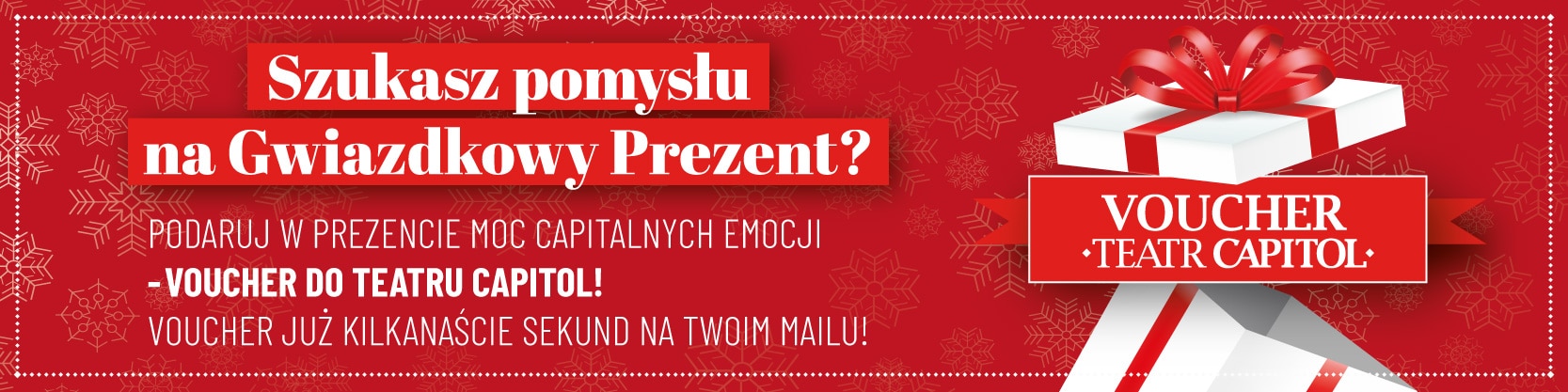 *Vouchera Teatru Capitol nie można wymienić na spektakle i wydarzenia specjalne zastrzeżone przez Dyrekcję Teatru Capitol tj.: premiery galowe, koncerty, Sylwester, Walentynki. Szczegóły w regulaminie vouchera.